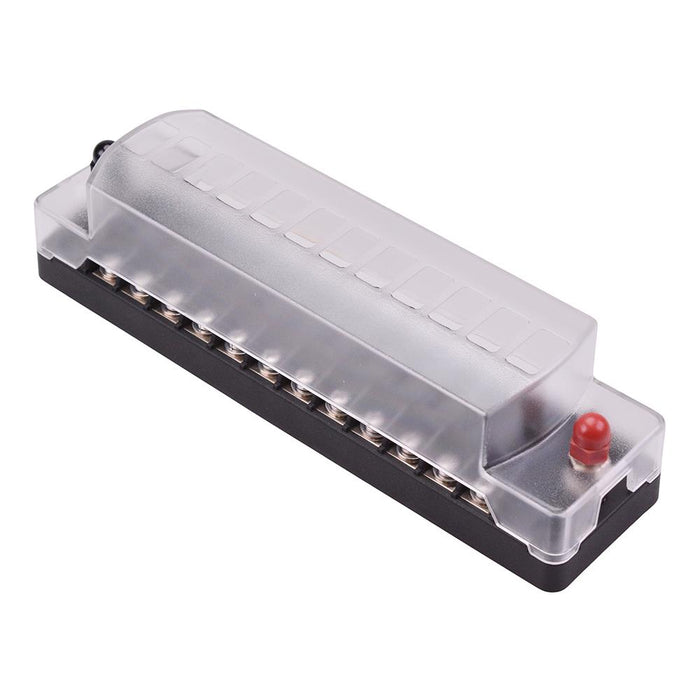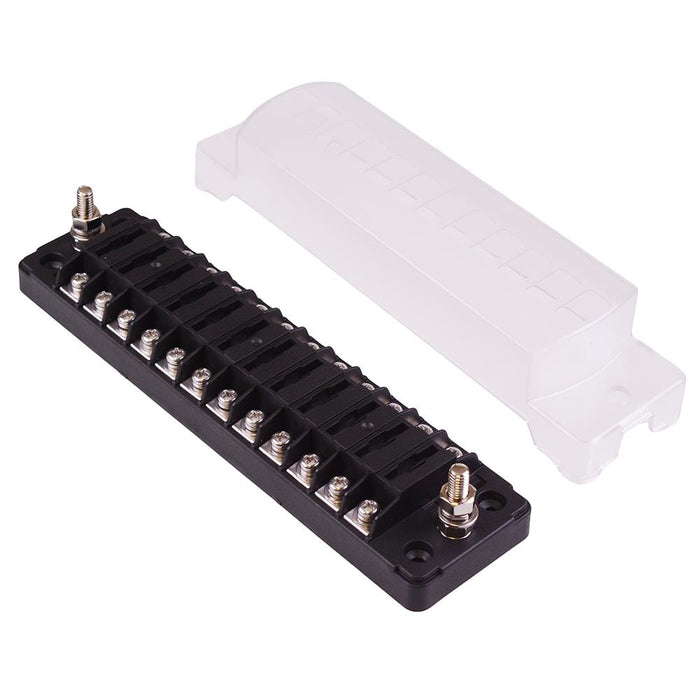 12 way fuse block compatible with standard blade fuses. The box comes supplied with a removable lid secured with 2 nuts, and labels for each fuse. The box is suitable for automotive and marine applications with blade fuses up to 20A.