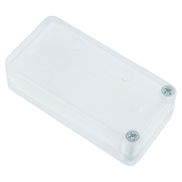 Colour: Clear Dimensions: 50 x 25 x 15.5mm (Length x Width x Depth Satin texture finish Cover is recessed for easy label installation Complete with 2 self tapping screws IP54 protection rating PCB standoffs moulded into the interior