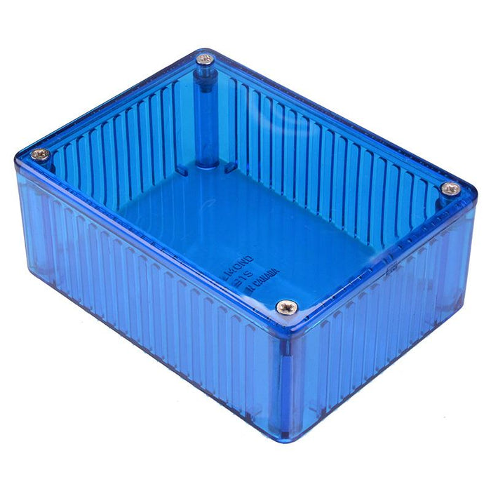 Hammond 1591 Series Translucent Polycarbonate Colour: Blue Includes M3 x 10mm Phillips machine Screws threaded into integral brass bushings Lap joint construction Dimensions: 110 x 82 x 44mm