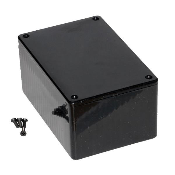 Hammond 1591 Series Colour: Black Includes M3 x 10mm Phillips machine Screws threaded into integral brass bushings Lapjoint construction Dimensions: 120 x 80 x 59mm