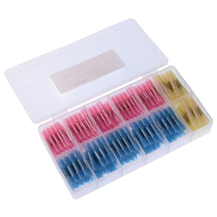 180 piece assortment of heatshrink sealed butt connectors providing a reliable and long lasting connection. The assortment includes red, blue and yellow terminals and comes in a handy compartment box.