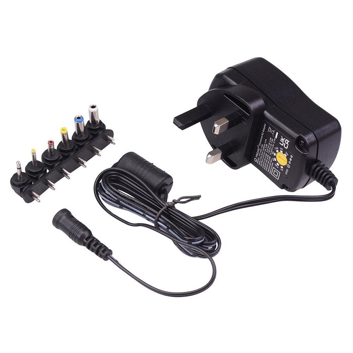Input voltage: 100-240VAC Output voltage: 3V, 4.5V, 5V, 6V, 7.5V, 9V, 12VDC Output current: 1A Power: 12W LED status indicator Supplied plugs: 3.5*1.35, 5.5*2.1, 5.5*2.5, 2.35*0.7, 4.0*1.7, 2.5 mono plug Complies with UKCA, CE, ROHS, REACH