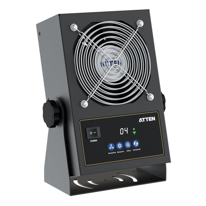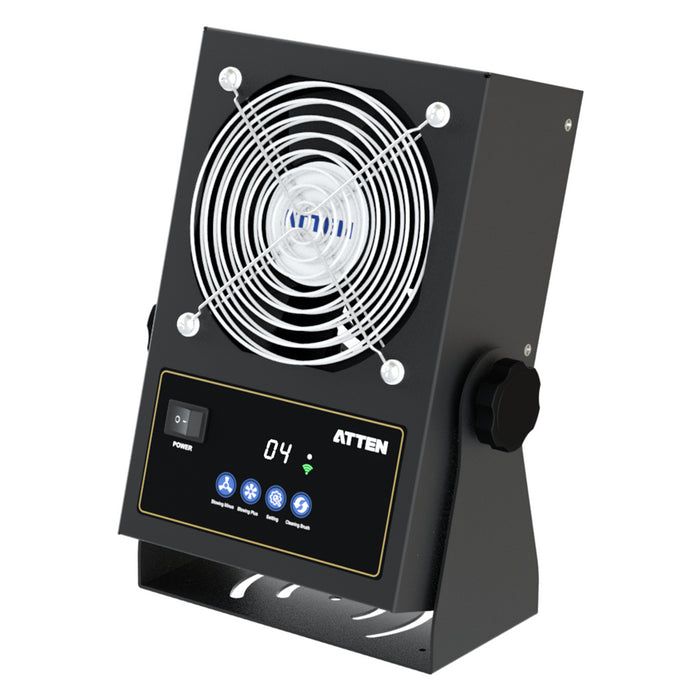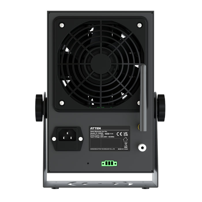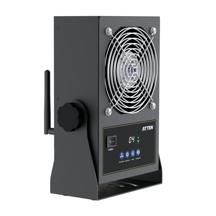 The ST-1020DX is an intelligent desktop DC ion fan that blows ionized air over the surface of electro-static sensitive products. The fan features variable speed control, suitable for both small and large areas, eliminating static electricity from 1000V to 100V within 1.2 seconds. The fan includes an IR remote control and connection to the PC via Wifi, allowing multiple linked units to be controlled via the network.