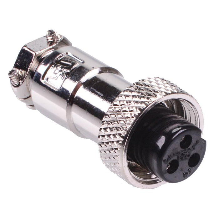 3 pole female circular connector featuring a metal body and IP55 protection rating. The plug features an M12 thread and 5A current rating.