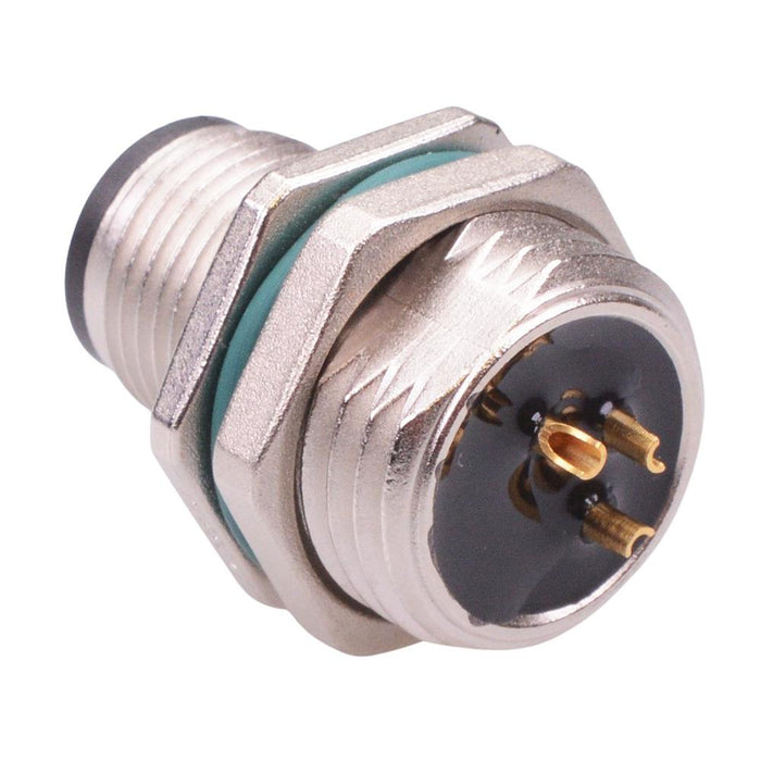 3 contact male receptacle featuring a M12 body with solder terminals, designed for front mounting to the panel. The connector is sealed to IP68 making it suitable for industrial, signal, power supply, data transmission and various other applications. The socket is compliant with IEC 61076 standard and is compatible with other connectors on the market with the same contact arrangement.