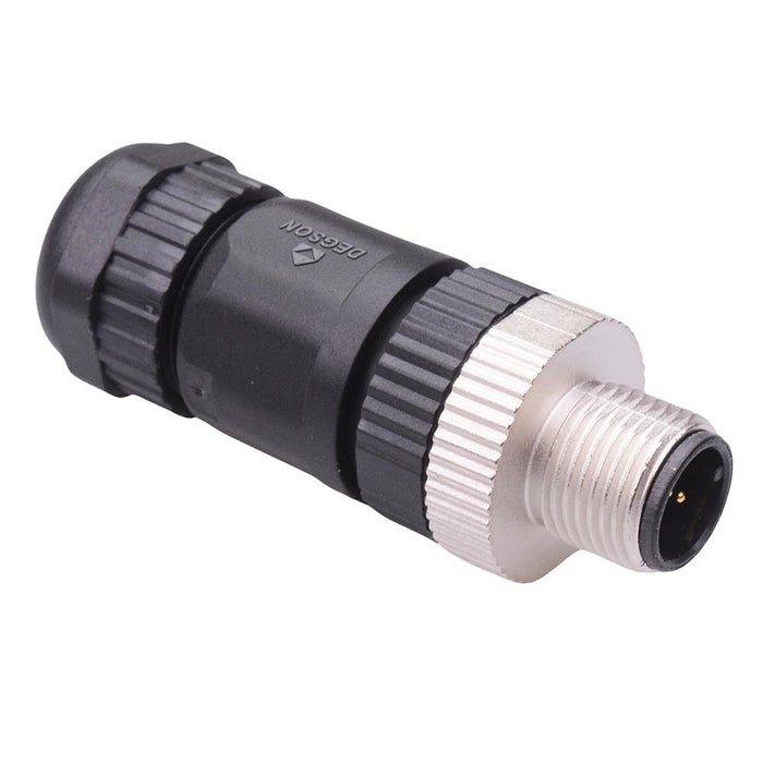 5 contact M12 male circular connector featuring a straight nylon body and screw connections. The connector is sealed to IP67 making it suitable for industrial, signal, power supply, data transmission and various other applications. The plug is compliant with IEC 61076 standard and is compatible with other connectors on the market with the same contact arrangement.