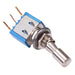 SPDT contacts On-(On) momentary operation Right angle PCB terminals Lever: round 14.85mm length 4.7mm pitch terminal spacing Rating: 4A 30VDC Panel cut-out: 6.5mm Epoxy sealed terminals APEM 5000 series