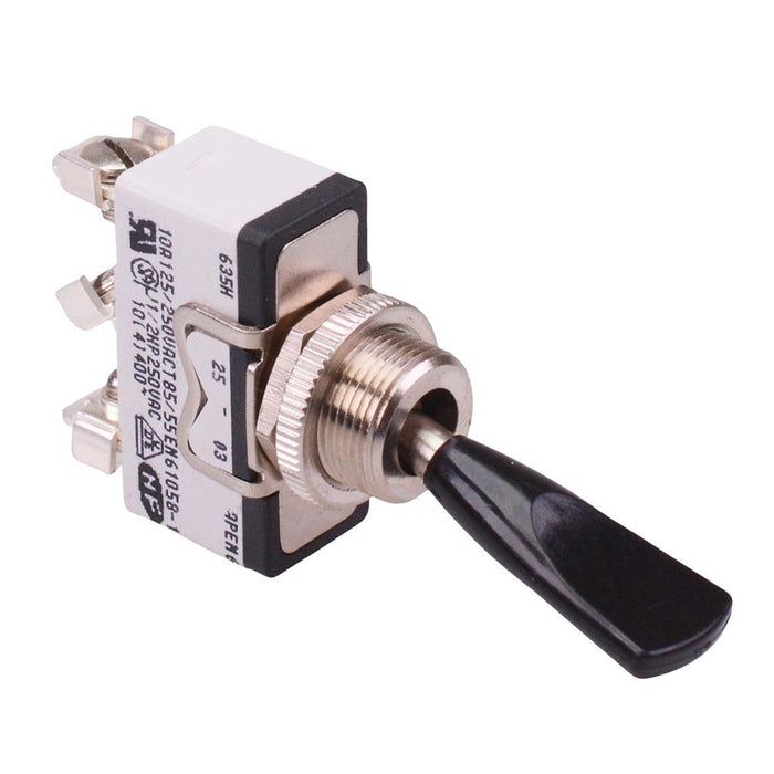 The 635HX2595 is a high amperage On-(On) momentary toggle switch featuring a robust construction and SPDT contacts. The switch features screw terminals and duckbill lever making it popular for a wide range of applications including automotive and marine.