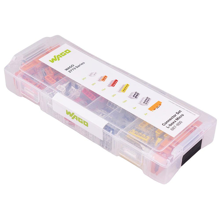 115 piece assorted box of the Wago 2773 series push-wire splice connectors and mounting carriers, housed in a handy compartment case. The 887-800 assortment compromises of the most popular sizes making it a cost effective solution for electricians, hobbyists and engineers.
