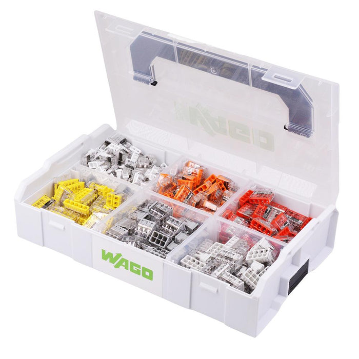 380 piece assorted box of the Wago 2773 series push-wire splice connectors housed in a handy compartment case. The 887-954 is the complete assortment compromising of all the sizes making it a cost effective solution for electricians, hobbyists and engineers.
