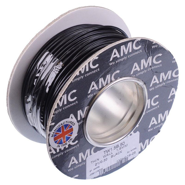 Black thin wall 1.5mm single core cable suitable for low voltage applications including automotive and marine applications. The cable features PVC insulation and provides excellent resistance against petrol, diesel, oil and other corrosive substances.