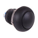 Black momentary push button switch featuring a round actuator and normally open contacts. The switch features IP65 protection rating and is suitable for mounting in 12mm diameter cut-outs. The switch is suitable for a wide range of applications including automotive, control panels, industrial, appliances etc.