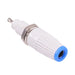 Blue 4mm binding post featuring an M8 thread and grey body manufactured from PBT. The binding post features a 2mm cross hole diameter and is suitable for a wide range of test and prototype applications.