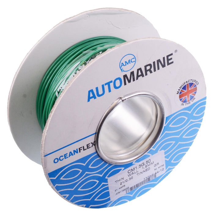 Green Oceanflex 1.5mm single core cable featuring a tinned copper conductor providing more resistance against corrosion, suitable for low voltage applications including automotive and marine. The cable features PVC insulation and provides excellent resistance against petrol, diesel, oil and other corrosive substances.