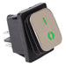 Green illuminated rocker switch featuring an attractive stainless steel actuator and IP65 protection rating. The switch features quick connect terminals and is suitable for a wide range of snap-in mounting applications including industrial, appliances etc.