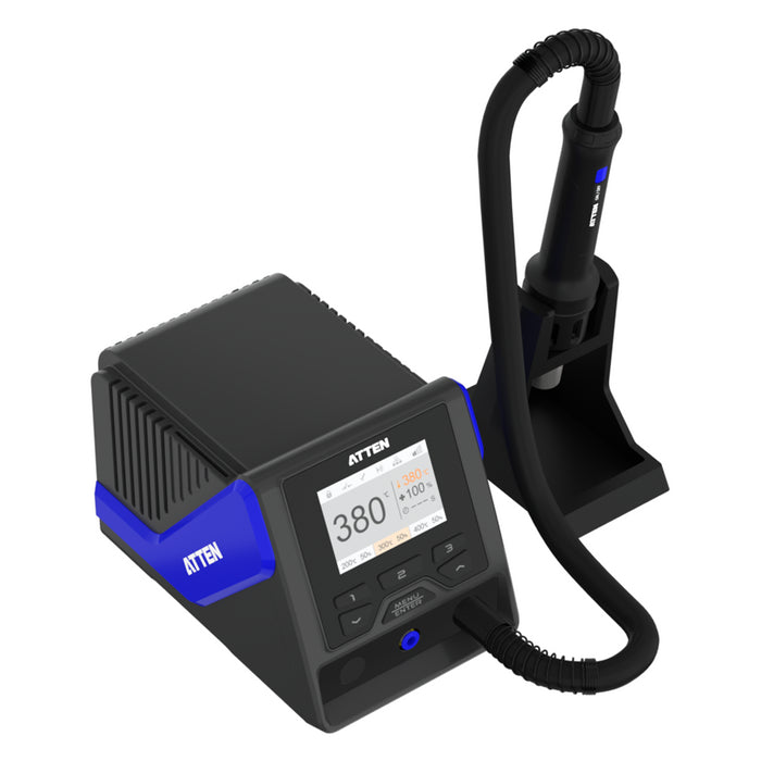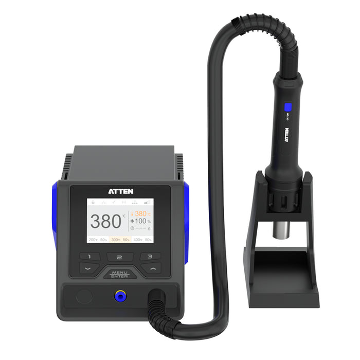 The GT-8100A is a professional intelligent rework station with a high temperature 1300W hot air gun. The station features rapid heat-up and various features including temperature calibration, 3 button shortcuts, IoT function, TFT colour screen and many more. The station is specifically designed for industrial and professional applications including production lines, electronic engineers and various others requiring a high performance hot air station.