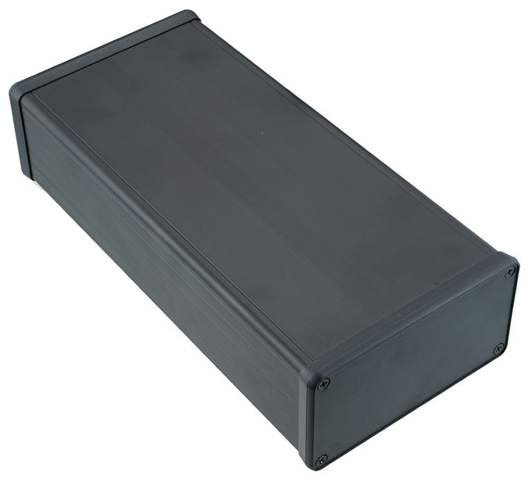 Hammond aluminium extruded enclosure with a black finish designed for housing PC boards. The enclosure features two ABS removable bezels and end panels secured by 4 screws each.