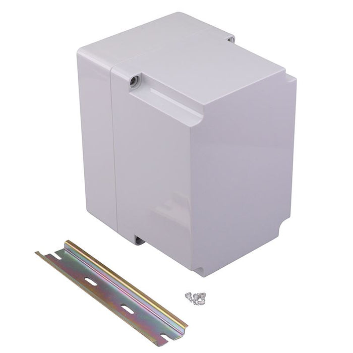 Protection level: IP66 Comes with 35mm of DIN rail Captive plastic screws in the lid Multiple slots for vertical PCB mounting Housing material: flame retardant ABS Robust to IK08 Colour: grey RAL 7035 Dimensions: 125 x 175 x 150mm (width x height x depth)