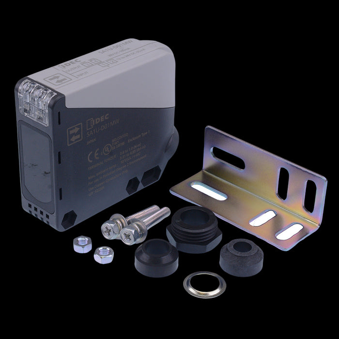 The SA1U-D01MW is a heavy duty photoelectric sensor switch featuring diffuse-reflective sensing, capable of sensing opaque and transparent objects up to a 1 meter distance. The sensor features NPN and PNP open collector dual outputs and interference prevention allowing two units to be mounted in close proximity.