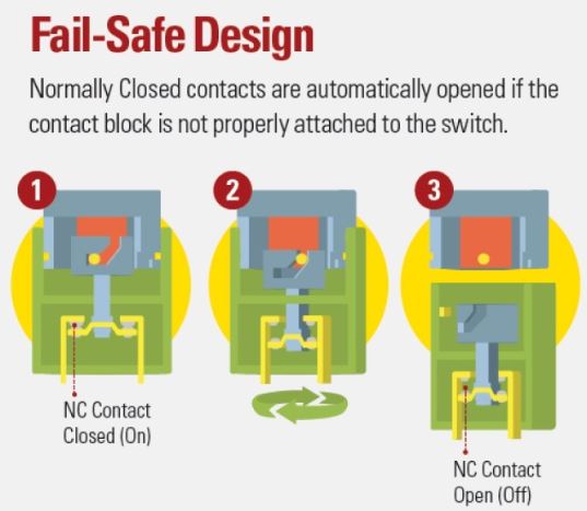 IDEC X-series switches use "Safe Break Action," a unique reverse energy structure that disconnects normally closed contacts, guaranteeing cut-off even if the emergency switch is damaged or the contact blocks separate.