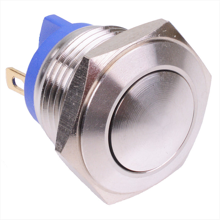 Momentary action SPST contacts 16mm panel cut-out Stainless steel body 2.8 x 0.5mm terminals 2A 48VDC rating 1,000,000 cycles mechanical life