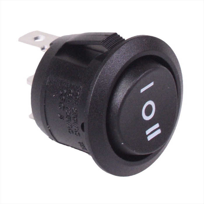 The R13-112I-02 is a momentary (On)-Off-(On) rocker switch housed in a 20mm circular package with white markings. The switch features SPDT contacts and quick connect terminals, suited for applications including automotive, industrial, appliances etc.