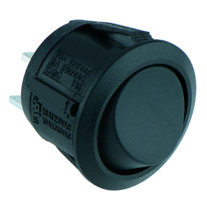 Round rocker switch featuring SPST contacts suitable for a wide range of applications including automotive.
