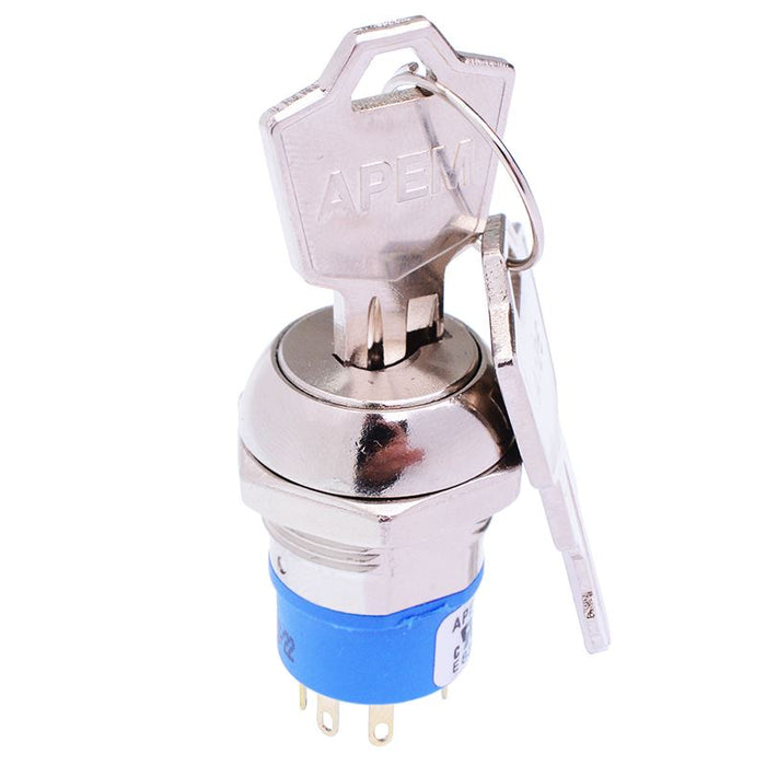The LK6JNB126N3 is a high quality key operated switch from the LK series manufactured by APEM. The switch features DP3T contacts and 3 maintained positions with key withdrawal in position 1,2,&3. The switch has a nickel plated finish and is suitable for 19mm panel cut-out applications requiring a reliable switching solution.
