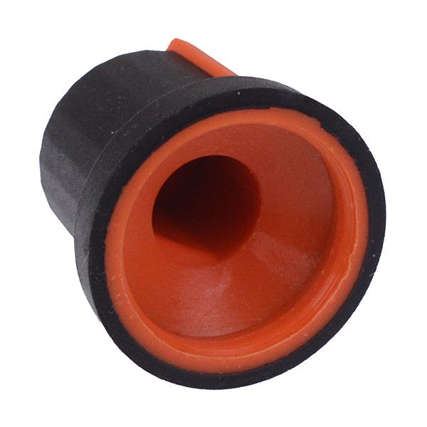CLIFF K87MBR black control knob with a moulded orange indication line. The knob has a rubberised soft-touch feel and is suitable for use with 6mm D shafts.