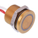 Body material: gold anodized Body colour: gold LED colour: red/green illumination: ring, 5VDC Panel cut-out: 19mm Contacts: SPST Protection rating: IP68, IP69K mounted on panel Rating: 200mA 24VAC/DC Terminals: flying leads Bushing: flat operator, 3mm height, Diameter: 22mm
