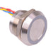 Body material: stainless steel LED colour: blue illumination: thin ring, 24VDC Panel cut-out: 22.2mm Contacts: SPST-NO Protection rating: IP68, IP69K mounted on panel Rating: 200mA 24VAC/DC Terminals: flying leads Bushing: chamfer, 4.5mm height Diameter: 28mm