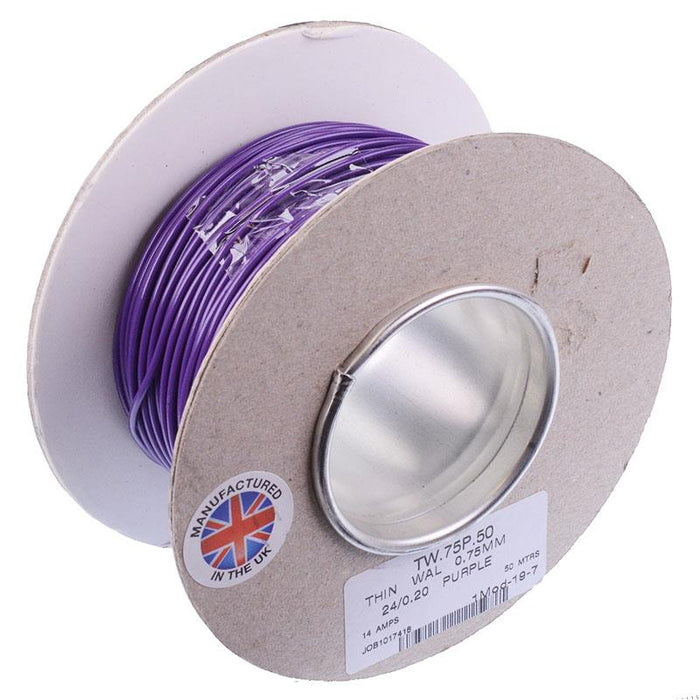 Purple thin wall 0.75mm single core cable suitable for low voltage applications including automotive and marine applications. The cable features PVC insulation and provides excellent resistance against petrol, diesel, oil and other corrosive substances.