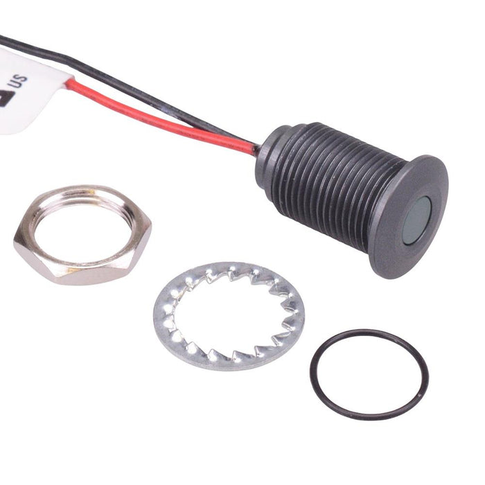 Colour: green Panel cut-out: 10mm Voltage rating: 2.2VDC Current rating: 20mA Panel thickness: 7mm max Brightness: 6mcd Operating voltage: 1.8 to 3.3VDC Bezel material: grey anodized aluminium Protection level: IP67 Terminal type: rear epoxy 200mm wires Length: 17.15mm Diameter: 12.7mm UL, REACH and RoHS certified