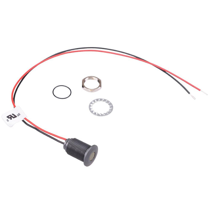 Colour: yellow Panel cut-out: 10mm Voltage rating: 24VDC Current rating: 20mA Panel thickness: 7mm max Brightness: 6mcd Operating voltage: 21.6 to 26.4VDC Bezel material: grey anodized aluminium Protection level: IP67 Terminal type: rear epoxy 200mm wires Length: 17.15mm Diameter: 12.7mm UL, REACH and RoHS certified
