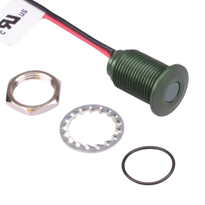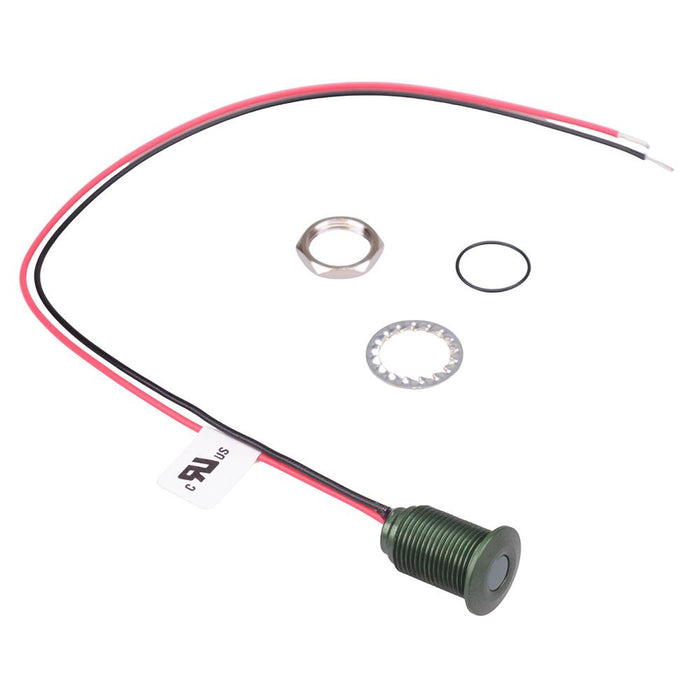 Colour: green Panel cut-out: 10mm Voltage rating: 3.3VDC Current rating: 20mA Panel thickness: 7mm max Brightness: 300mcd Operating voltage: 1.8 to 3.3VDC Bezel material: green anodized aluminium Protection level: IP67 Terminal type: rear epoxy 200mm wires Length: 17.15mm Diameter: 12.7mm UL, REACH and RoHS certified