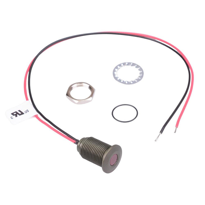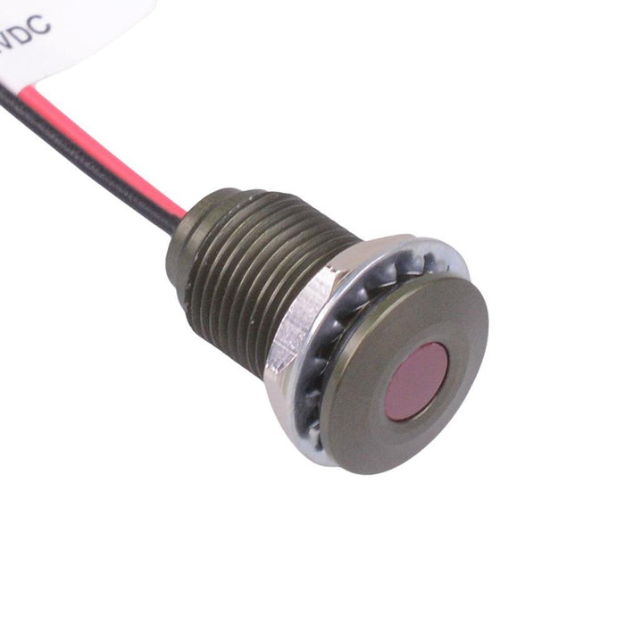 Colour: red Panel cut-out: 10mm Voltage rating: 12VDC Current rating: 20mA Panel thickness: 7mm max Brightness: 6mcd Operating voltage: 10.8 to 13.2VDC Bezel material: dark olive anodized aluminium Protection level: IP67 Terminal type: rear epoxy 200mm wires Length: 17.15mm Diameter: 12.7mm UL, REACH and RoHS certified