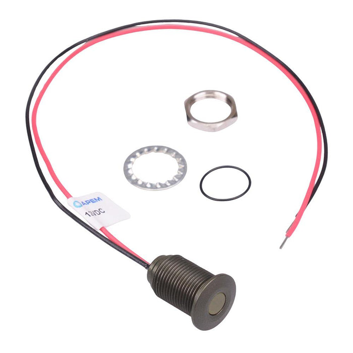 The Q10F5AKXXY12E is a yellow panel mount LED indicator from the APEM Q10 series, featuring a 10mm cut-out and sealed to IP67. The indicator features a flush dark olive anodized aluminium bezel and rear epoxy sealed 200mm tail wires. The panel indicator is UL certified and suitable for the most demanding of applications.
