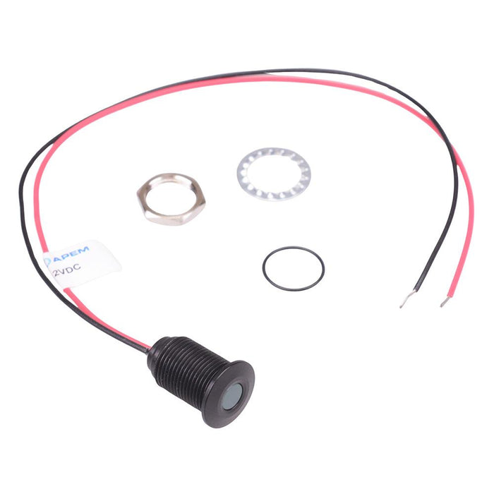The Q10F5ANXXG12E is a green panel mount LED indicator from the APEM Q10 series, featuring a 10mm cut-out and sealed to IP67. The indicator features a flush black anodized aluminium bezel and rear epoxy sealed 200mm tail wires. The panel indicator is UL certified and suitable for the most demanding of applications.
