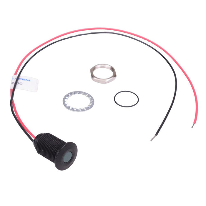 Colour: green Panel cut-out: 10mm Voltage rating: 24VDC Current rating: 20mA Panel thickness: 7mm max Brightness: 6mcd Operating voltage: 21.6 to 26.4VDC Bezel material: black anodized aluminium Protection level: IP67 Terminal type: rear epoxy 200mm wires Length: 17.15mm Diameter: 12.7mm UL, REACH and RoHS certified
