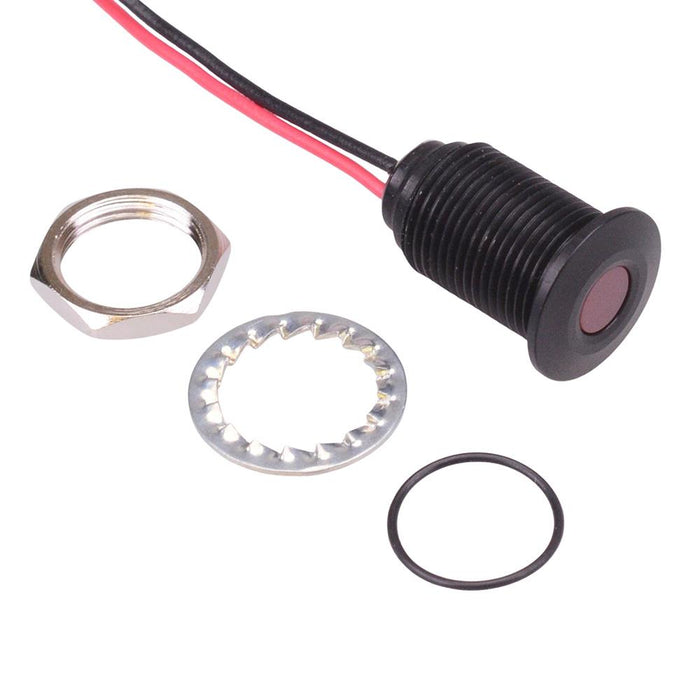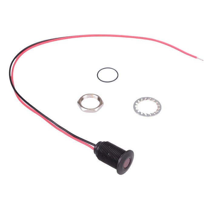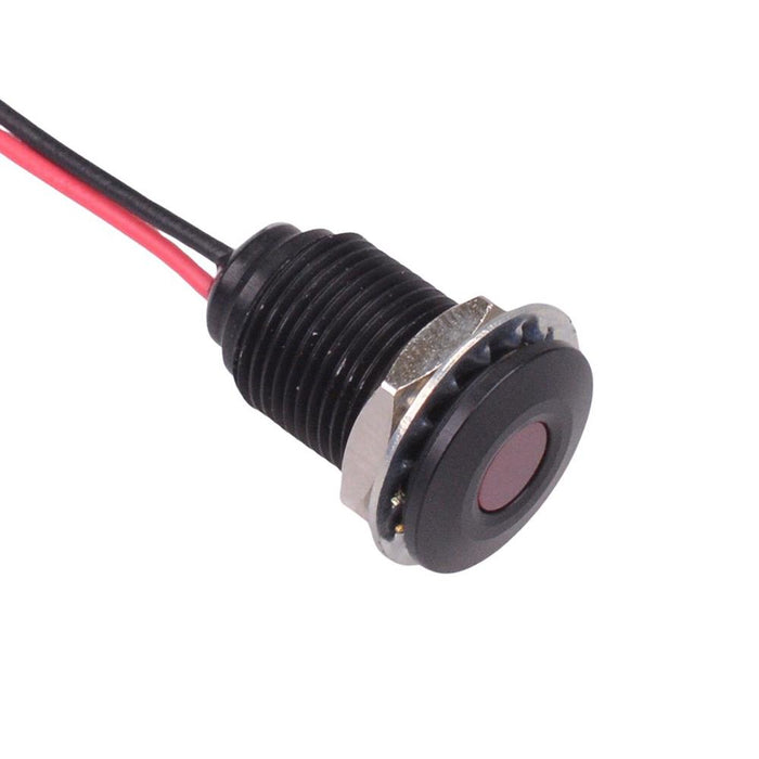 Colour: red Panel cut-out: 10mm Voltage rating: 2.2VDC Current rating: 20mA Panel thickness: 7mm max Brightness: 6mcd Operating voltage: 1.8 to 3.3VDC Bezel material: black anodized aluminium Protection level: IP67 Terminal type: rear epoxy 200mm wires Length: 17.15mm Diameter: 12.7mm UL, REACH and RoHS certified