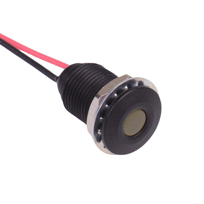 Colour: yellow Panel cut-out: 10mm Voltage rating: 12VDC Current rating: 20mA Panel thickness: 7mm max Brightness: 6mcd Operating voltage: 10.8 to 13.2VDC Bezel material: black anodized aluminium Protection level: IP67 Terminal type: rear epoxy 200mm wires Length: 17.15mm Diameter: 12.7mm UL, REACH and RoHS certified
