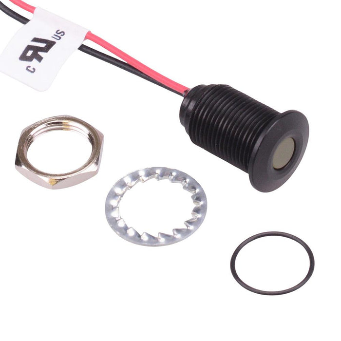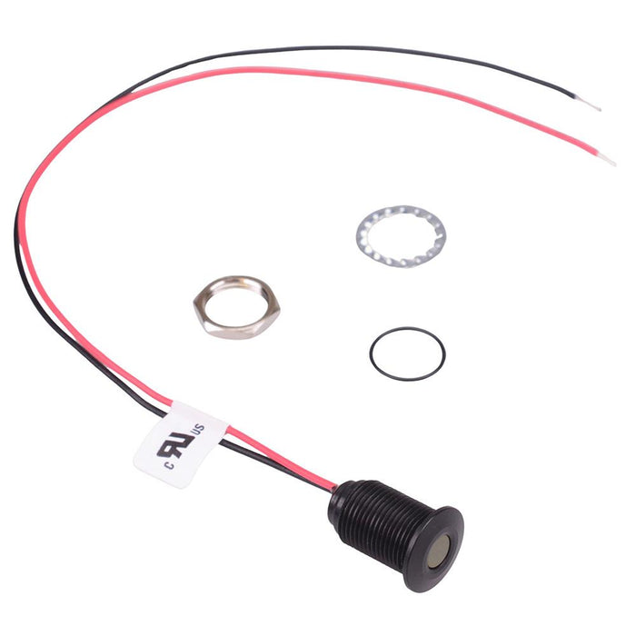 The Q10F5ANXXY24E is a yellow panel mount LED indicator from the APEM Q10 series, featuring a 10mm cut-out and sealed to IP67. The indicator features a flush black anodized aluminium bezel and rear epoxy sealed 200mm tail wires. The panel indicator is UL certified and suitable for the most demanding of applications.