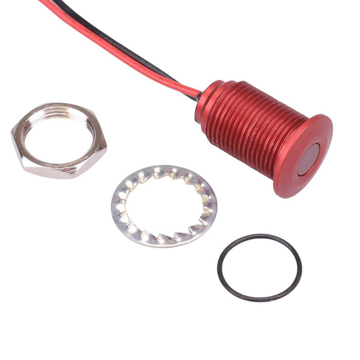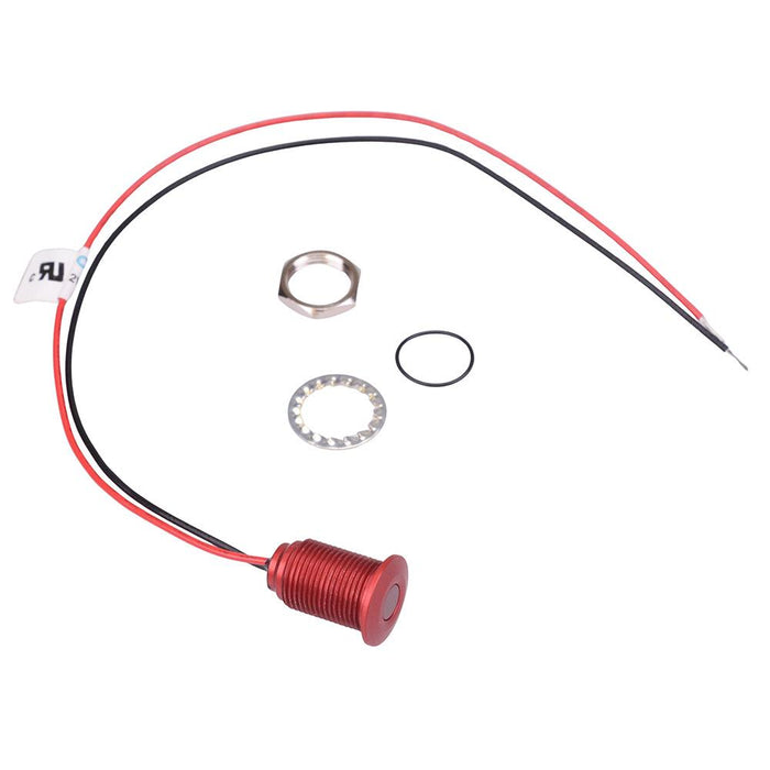 Colour: red Panel cut-out: 10mm Voltage rating: 2.2VDC Current rating: 20mA Panel thickness: 7mm max Brightness: 6mcd Operating voltage: 1.8 to 3.3VDC Bezel material: red anodized aluminium Protection level: IP67 Terminal type: rear epoxy 200mm wires Length: 17.15mm Diameter: 12.7mm UL, REACH and RoHS certified