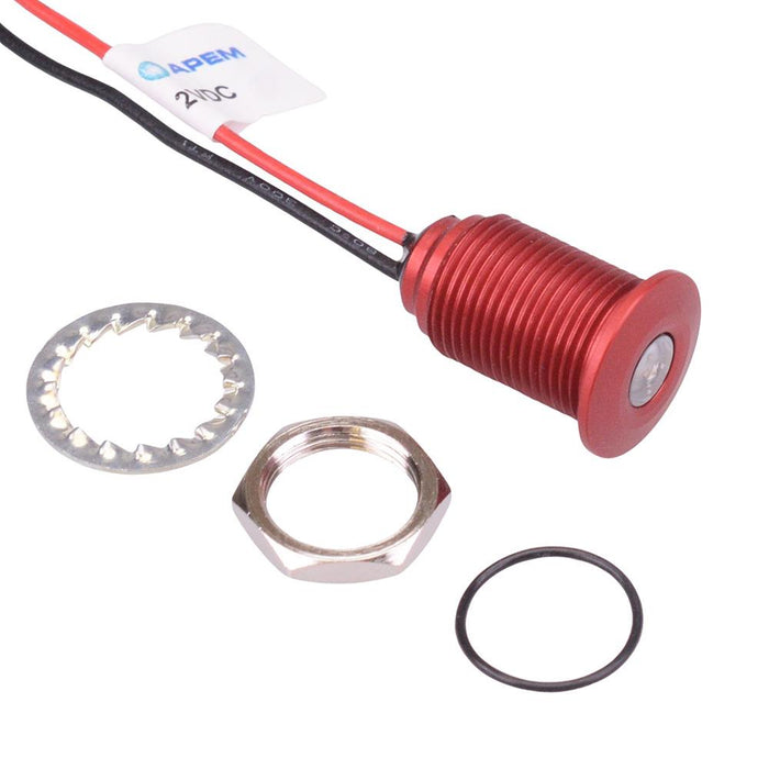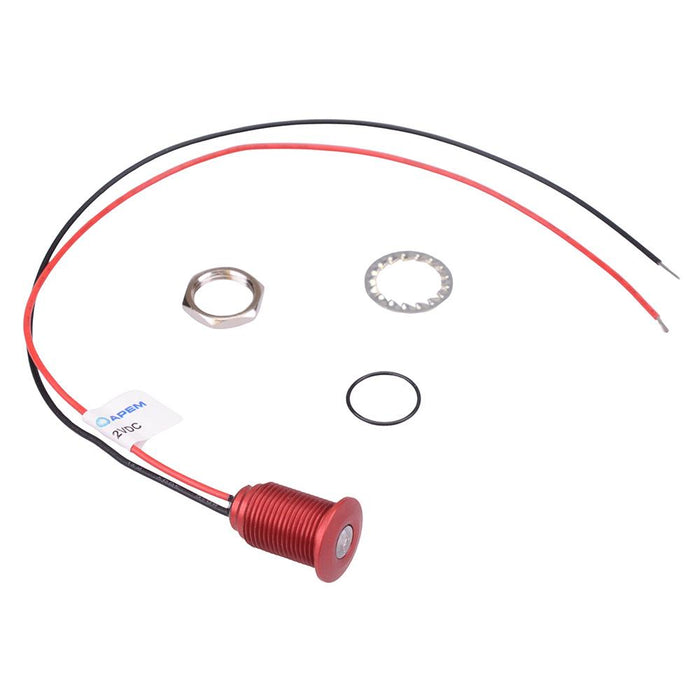 Colour: red Panel cut-out: 10mm Voltage rating: 2.2VDC Current rating: 20mA Panel thickness: 7mm max Brightness: 1300mcd Operating voltage: 1.8 to 3.3VDC Bezel material: red anodized aluminium Protection level: IP67 Terminal type: rear epoxy 200mm wires Length: 17.15mm Diameter: 12.7mm UL, REACH and RoHS certified