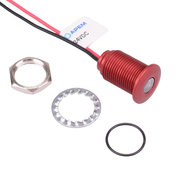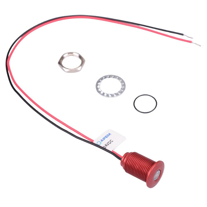 Colour: red Panel cut-out: 10mm Voltage rating: 24VDC Current rating: 20mA Panel thickness: 7mm max Brightness: 1300mcd Operating voltage: 21.6 to 26.4VDC Bezel material: red anodized aluminium Protection level: IP67 Terminal type: rear epoxy 200mm wires Length: 17.15mm Diameter: 12.7mm UL, REACH and RoHS certified