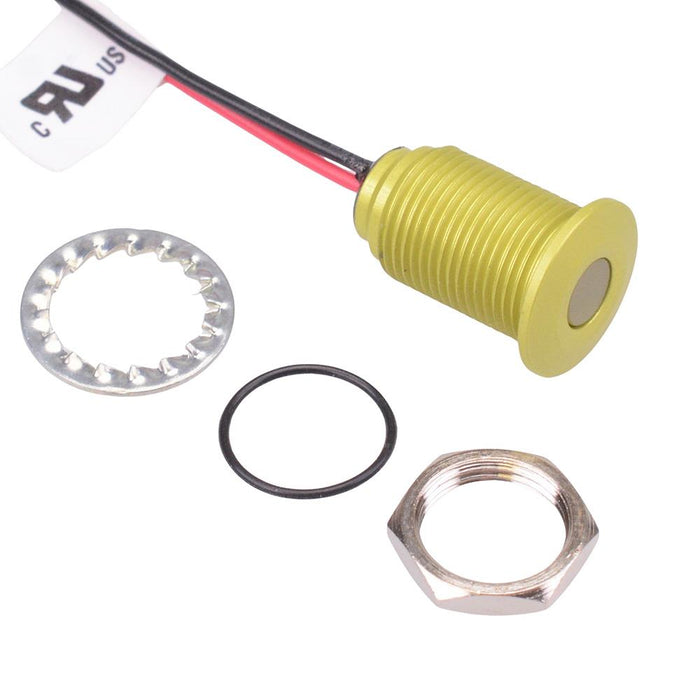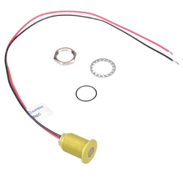 Colour: yellow Panel cut-out: 10mm Voltage rating: 2VDC Current rating: 20mA Panel thickness: 7mm max Brightness: 250mcd Operating voltage: 1.8 to 3.3VDC Bezel material: yellow anodized aluminium Protection level: IP67 Terminal type: rear epoxy 200mm wires Length: 17.15mm Diameter: 12.7mm UL, REACH and RoHS certified