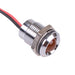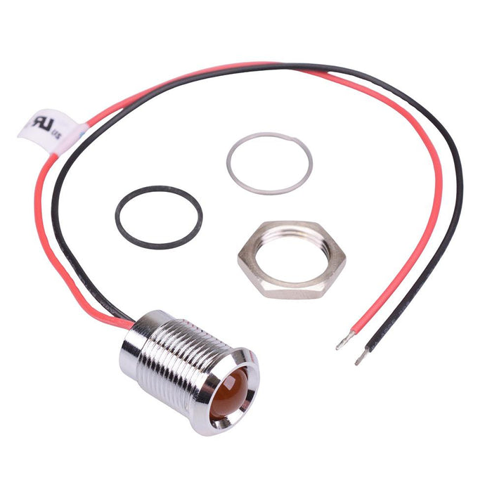 Colour: orange Panel cut-out: 14mm Voltage rating: 12VDC Current rating: 20mA Panel thickness: 11mm max Brightness: 850mcd Operating voltage: 10.8 to 13.2VDC Bezel material: chrome plated brass Protection level: IP67 Terminal type: rear epoxy 200mm wires Length: 24.75mm Diameter: 16mm UL, REACH and RoHS certified
