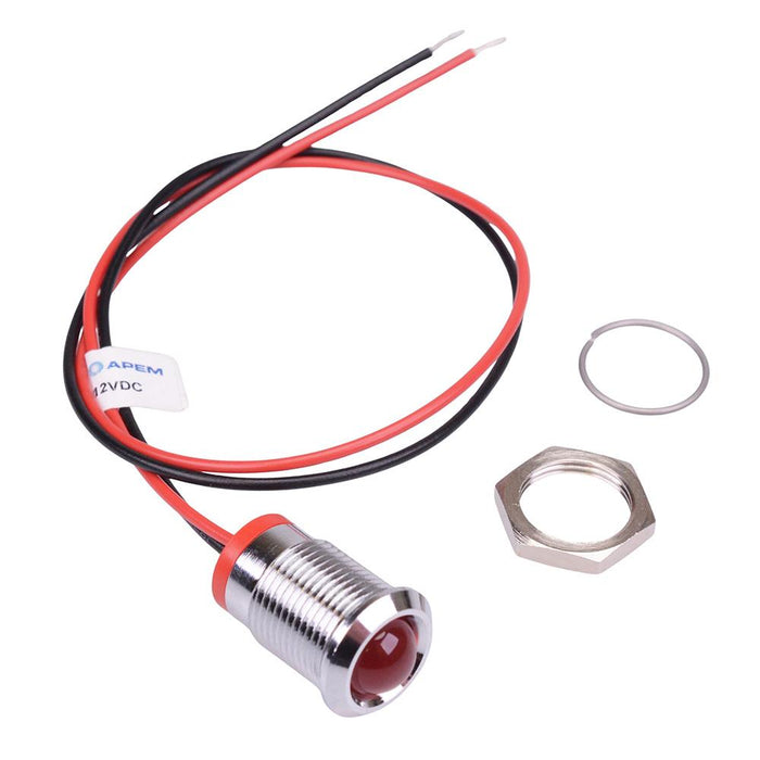 The Q14P7CXXR12-X0012 is a red panel mount LED indicator from the APEM Q14 series, featuring a 14mm cut-out. The indicator features a prominent chrome bezel and 300mm tail wires. The panel indicator is UL certified and suitable for the most demanding of applications.