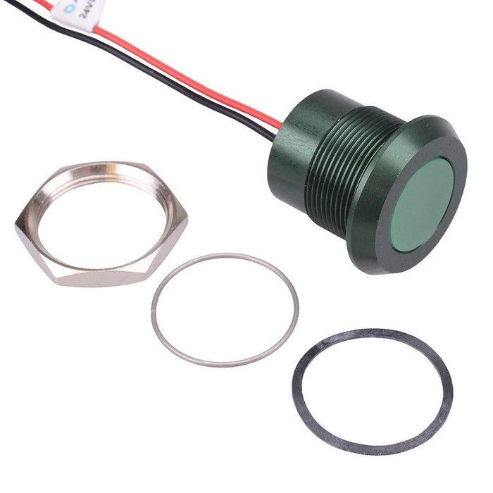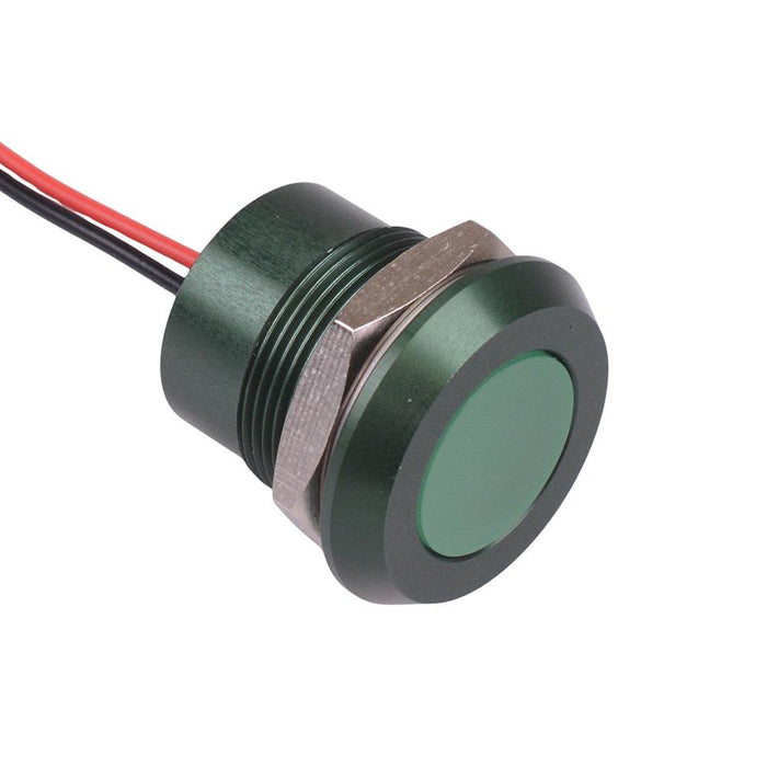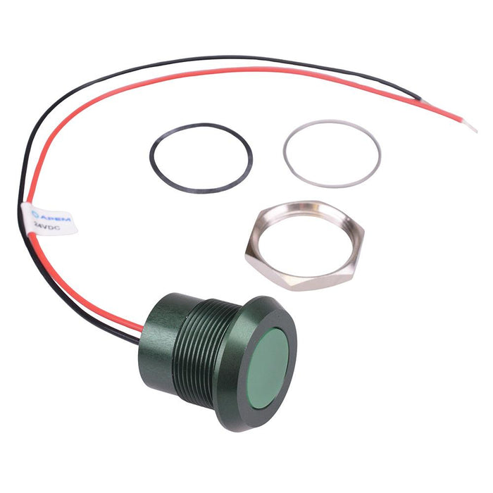 Colour: green Panel cut-out: 22mm Voltage rating: 24VDC Current rating: 40mA Panel thickness: 10mm max Brightness: 245mcd Operating voltage: 21.6 to 26.4VDC Bezel material: green anodized aluminium Protection level: IP67 Terminal type: rear epoxy 200mm wires Length: 24.5mm Diameter: 28mm UL, REACH and RoHS certified