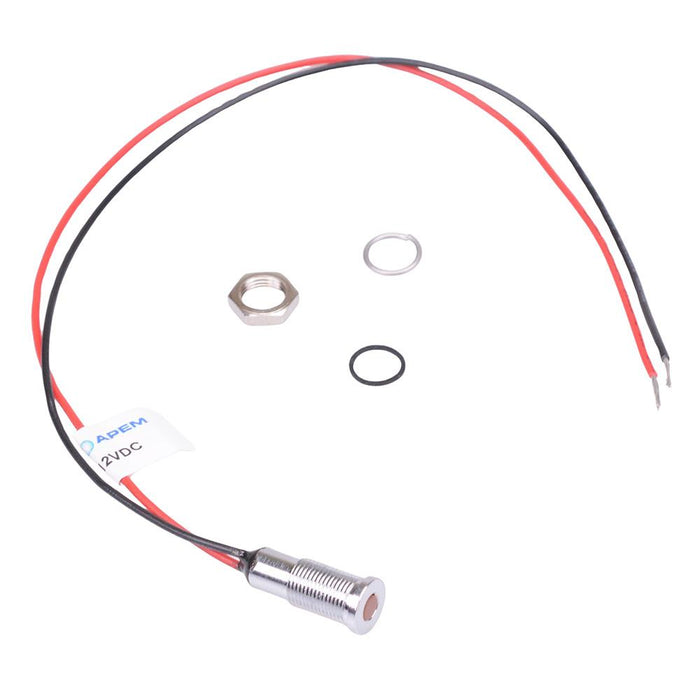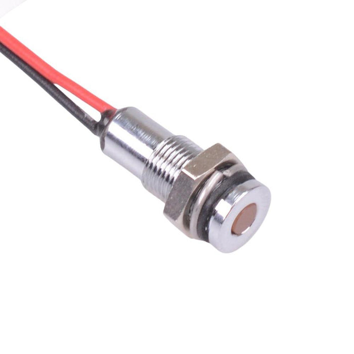 Colour: orange Panel cut-out: 6mm Voltage rating: 12VDC Current rating: 20mA Panel thickness: 7mm max Brightness: 10mcd Operating voltage: 10.8 to 13.2VDC Bezel material: chrome plated brass Protection level: IP67 Terminal type: rear epoxy 200mm wires Length: 14.9mm Diameter: 6.9mm UL, REACH and RoHS certified